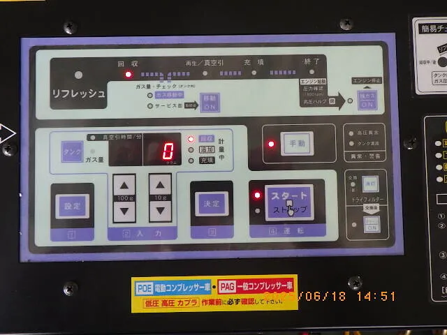 機械のホース左側の車のエアコンホースにつないでガスをいれていきます。